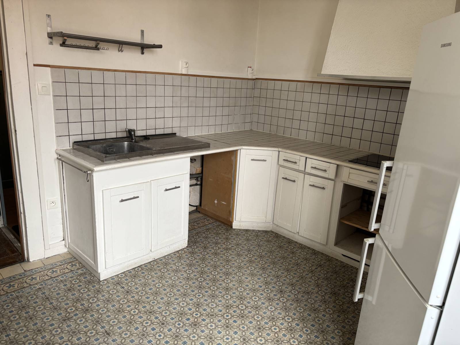 Double Living, parquet et beaux plafonds. Grande cuisine aménagée, salle de douche ,et WC.