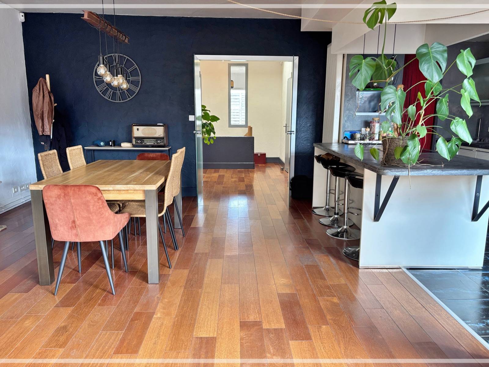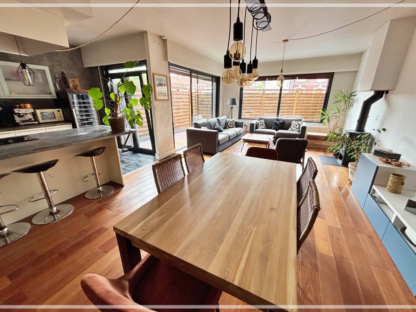 •Salon-séjour lumineux de 37m2 avec cuisine ouverte équipée avec des matériaux de qualité.