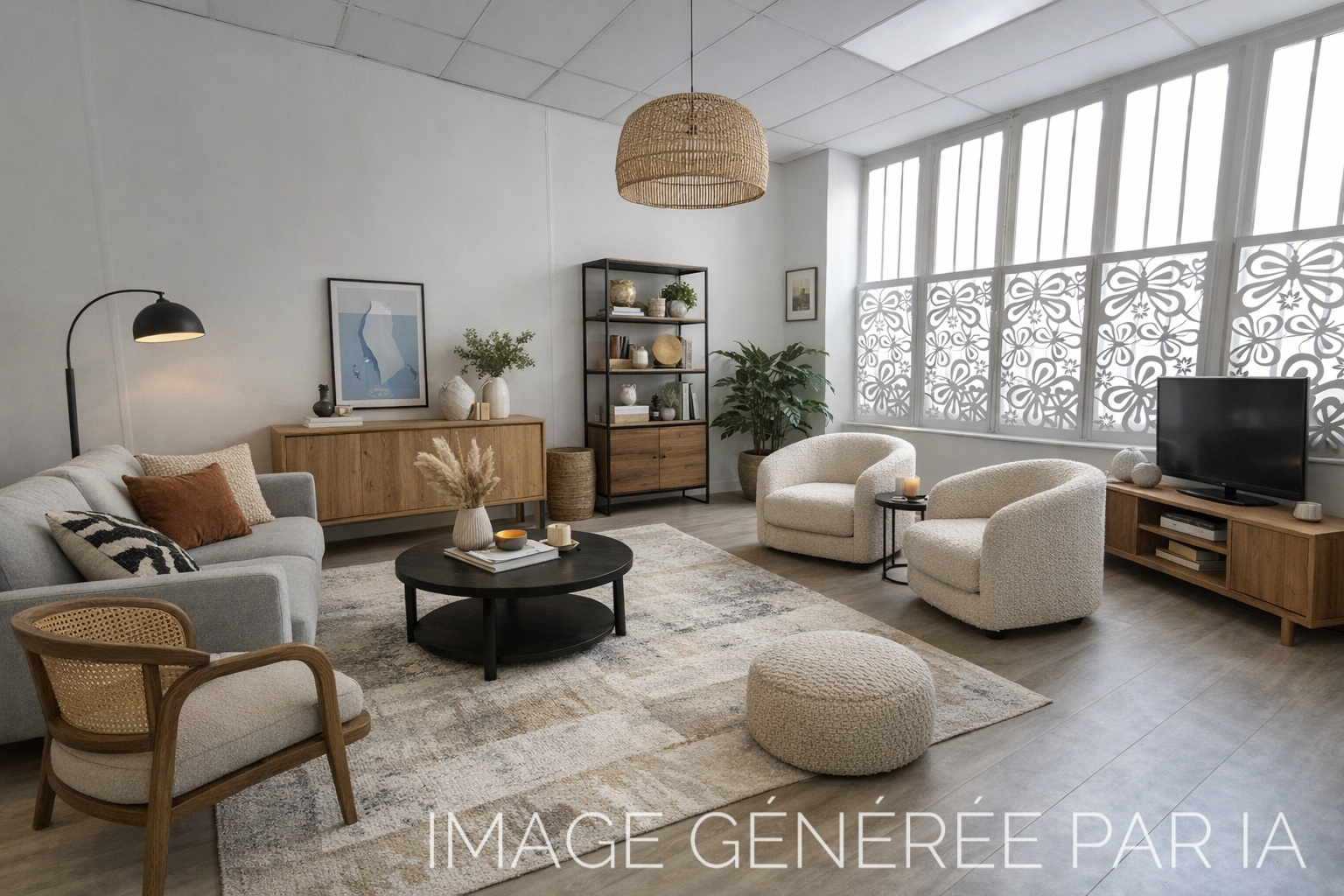 Résidence les 3 Censes, avenue Gustave Delory sur Roubaix Barbieux, Ambiance LOFT Type 2 d'environ 66 m2 Séjour béton ciré, cuisine équipée, persiennes salle de douche , chambre de 23m2 en...